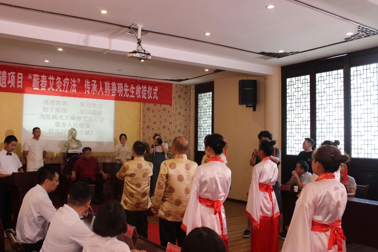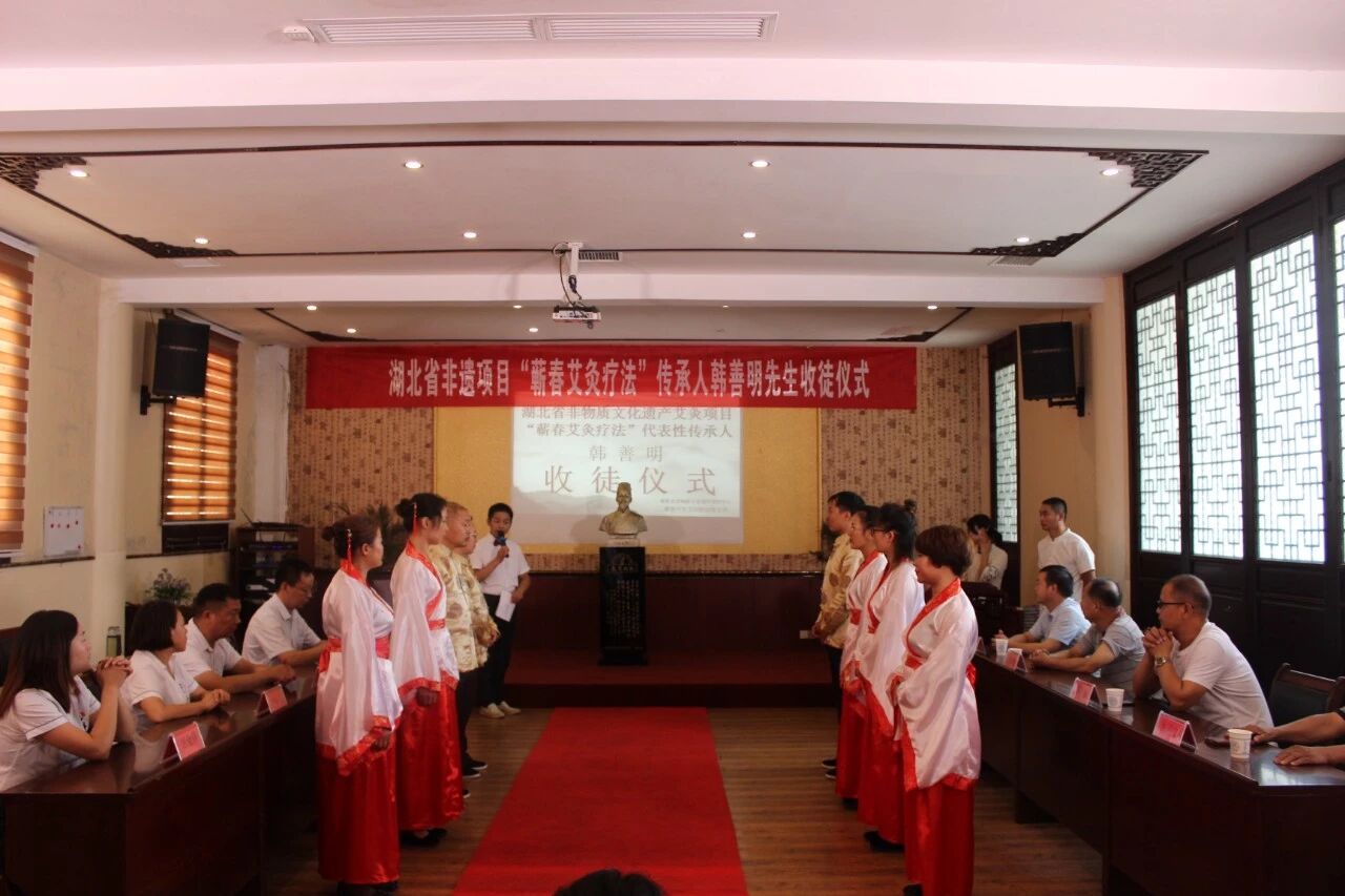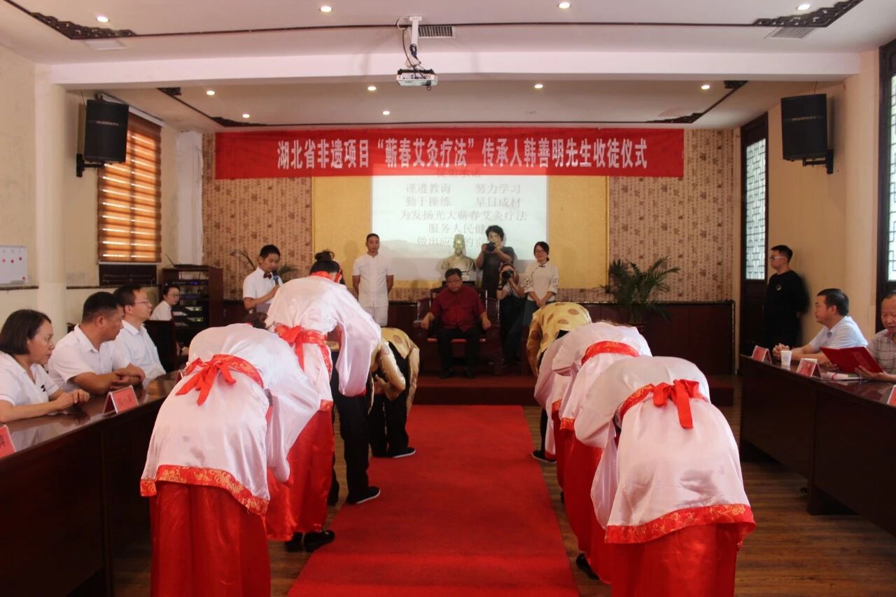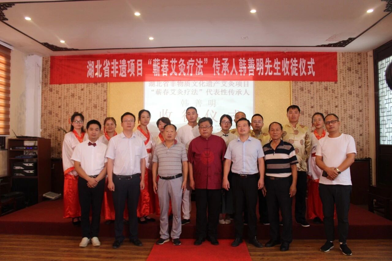 “师带徒”是千百年来中医培养人才的重要途径,是中医传统的传承方式。中国拥有五千年文明历史,素有“礼仪之邦”之称,讲究尊师重道,注重拜师礼仪。俗语有云:“生我者父母,教我者师父”,而拜师礼就是尊师重道的体现,也是师徒结拜的见证。建立如此重大的关系,自然需要隆重的风俗礼仪加以确认和保护。8月29日上午,“蕲春艾灸疗法”传承人韩善明收徒仪式在蕲春千年艾隆重举行。蕲春县县健康办副主任杜伟,县非遗中心副主任袁朝阳,县劳动就业局培训中心副主任田树林作为嘉宾出席本次收徒仪式。