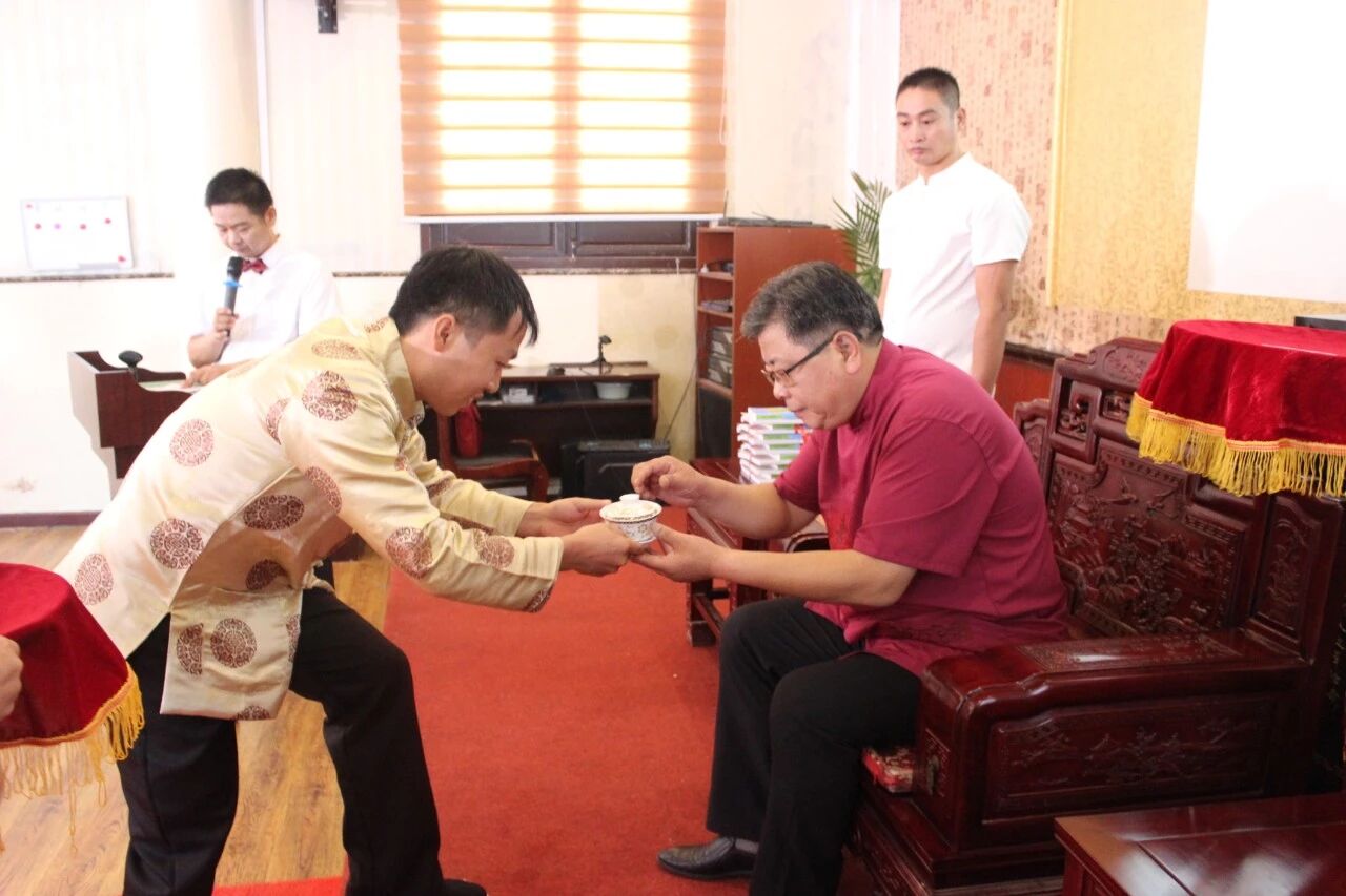 所有弟子在见证者面前对师父宣誓承诺,愿以一生的精力为艾灸的发展贡献身心,并向师父韩善明先生敬拜师茶、递拜师贴。韩善明先生也为众弟子提出必须要遵守的入门师训,师训内容为: